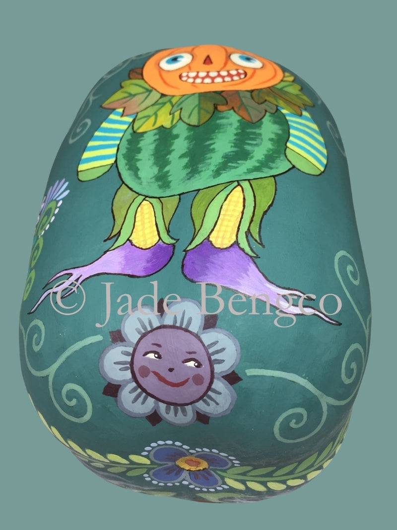 This one-of-a-kind Halloween fantasy gourd, titled “Smokin’”, is a vibrant hand-painted artwork full of gothic whimsy and seasonal charm. One side features a voluptuous bat lady rising from a smoking, bat-winged jack-o’-lantern; the side panels display curling vines and black cats in ruffled collars; and the reverse reveals a cheeky pumpkin man with a watermelon body, corn legs, sugar beet shoes, and a striped sweater ending in pickle hands—watched over by an impish bat boy with speckled wings. Sealed with multiple coats of acid-free, non-yellowing satin varnish for lasting protection, this unique piece comes with a simple painted cardboard stand for display. A delightfully imaginative centerpiece for any Halloween or fantasy art collection.