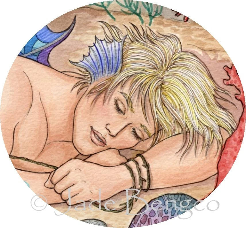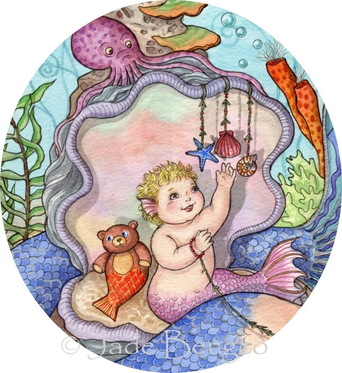Babysitter captures a heartwarming undersea moment between a sleepy merman dad and his playful merbaby. Resting beside her clamshell playpen filled with sea toys and a mer-teddy bear, the devoted father keeps her close with a seaweed twine tied from her wrist to his. A curious octopus and colorful fish look on as the tranquil scene unfolds—a tender, whimsical portrayal of underwater parenthood rendered in ink, watercolor, and acrylic.