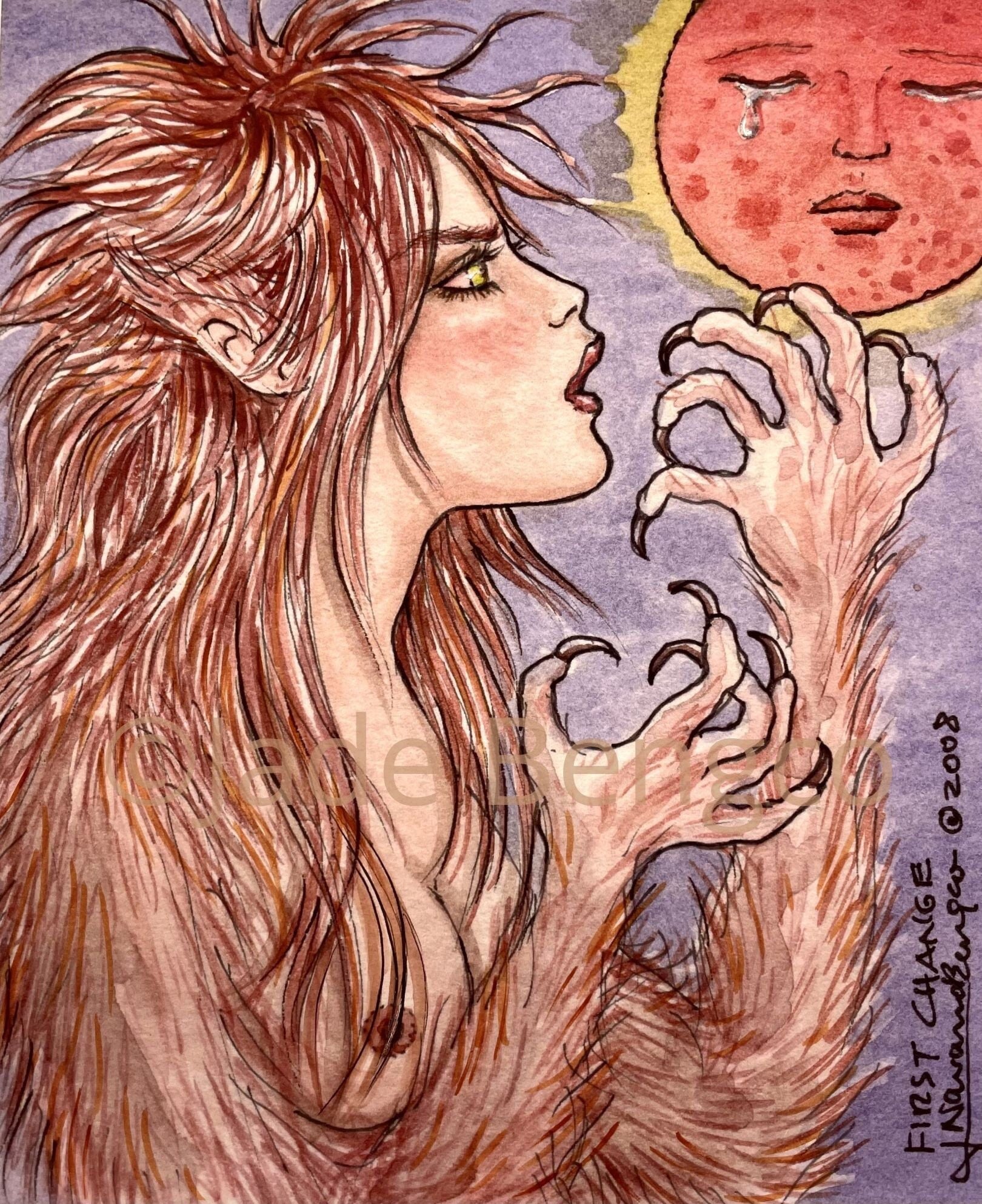 Titled First Change, this dramatic limited edition fantasy art print captures the haunting transformation of a young woman during the rise of the blood moon. Once a helpless victim of a werewolf attack that claimed her companion’s life, she now experiences her own horrifying metamorphosis—the moment of her first change. Bathed in the eerie crimson light of the moon, her expression reflects the struggle between humanity and the beast within. Rich tones of red, shadow, and silver bring the scene to life, evoking both terror and tragic beauty. A powerful and atmospheric addition to any werewolf, horror, or Halloween-themed art collection.