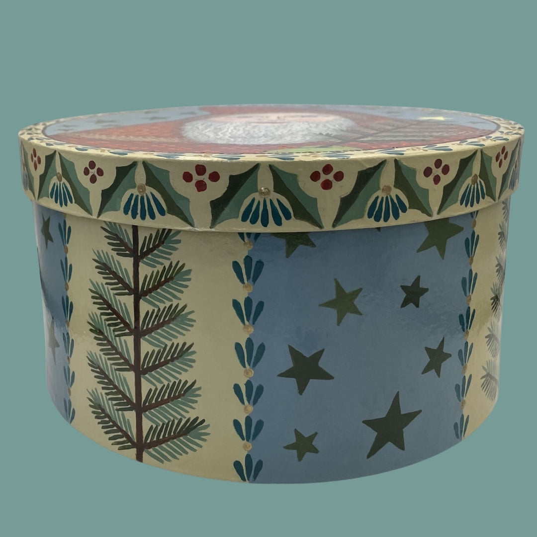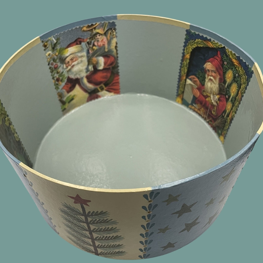 Titled Florentine Santa, this beautifully hand-painted paper mâché box is a charming Yuletide collectible created in subtle, traditional holiday tones. Santa is depicted wearing a richly detailed Florentine-style coat and caped hood in warm shades of rusty cinnamon red, holding a small pine tree topped with a golden star. Inside the lid is a decoupaged image of a vintage Santa offering a dish of steaming plum pudding, while the interior of the box features four additional vintage Santa images. The bottom is adorned with a hand-painted multi-pointed star surrounded by stylized leaves and gold berries. Both the exterior and interior are finished with multiple coats of satin polyurethane varnish for protection and a gentle sheen. Signed and dated by the artist, this OOAK piece is perfect for storing ornaments, keepsakes, or simply displaying as part of a treasured Santa or holiday collection.