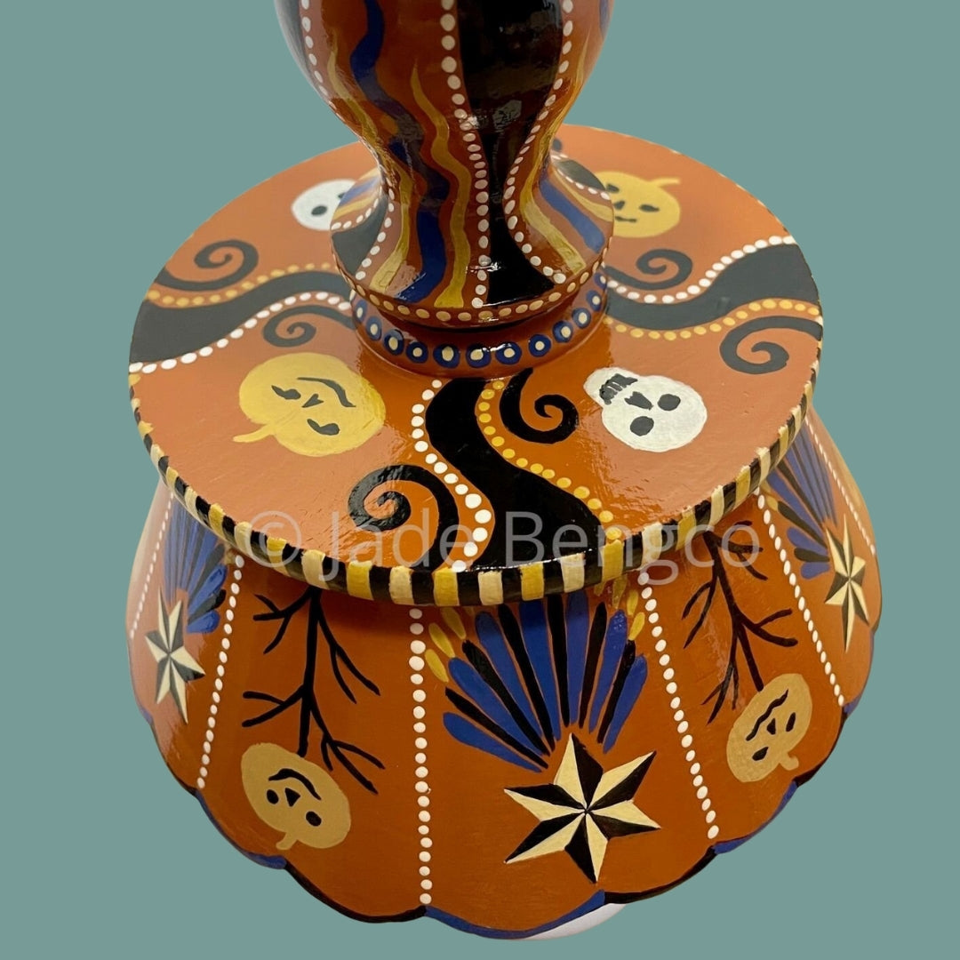 Titled Halloween Fun, this OOAK hand-painted vintage wood candy dish captures the whimsy and nostalgia of Halloween in rich autumn tones of terra cotta, blue, golden yellow, tan, taupe, and soft white. The scalloped-edged bowl features a radiant full moon with a lady’s face surrounded by drifting clouds, twinkling stars, and two playful spirits. Every inch of the dish is meticulously painted—inside, outside, and even underneath—then sealed with multiple coats of semi-gloss polyurethane varnish for lasting beauty and protection. Both functional and collectible, this enchanting piece is a wonderful heirloom-quality addition to any Halloween or folk art collection.