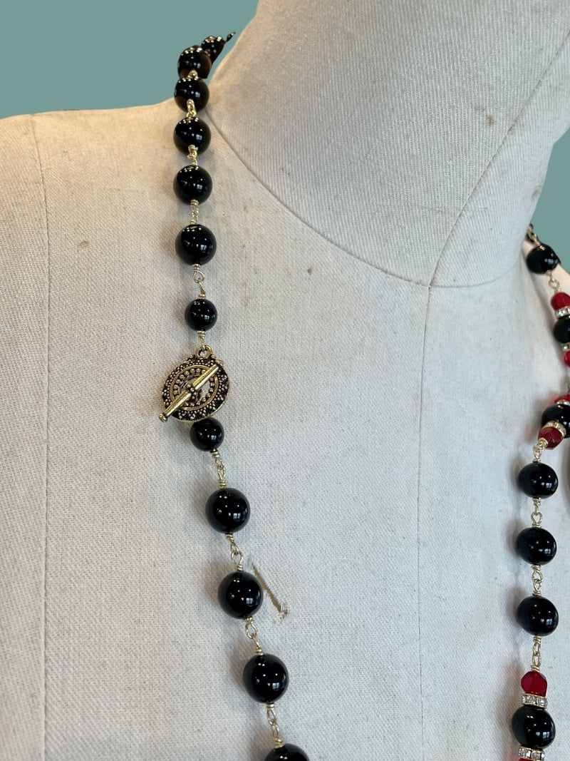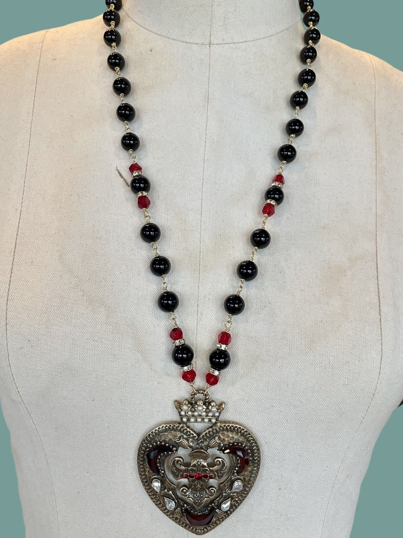 Artisan Necklace Assemblage – Vintage Heart, Rhinestones, Black Onyx & Red Glass Beads