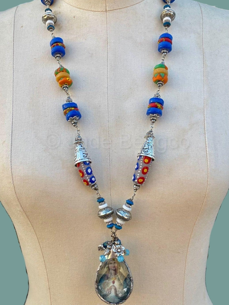 This one-of-a-kind artisan necklace features a vintage reproduction of the Immaculate Heart of Mary, encased beneath a faceted crystal prism repurposed from an antique chandelier. The back is sculpted from air-dry clay, embossed, and finished with silver leaf and satin varnish for a luminous touch. The pewter-capped pendant hangs from a strand of silver-plated wire adorned with African kobol glass beads, vintage glass beads, and sparkling crystal rondelles. Substantial yet comfortable, this bold statement piece beautifully combines faith, artistry, and vintage charm—truly a one-of-a-kind creation.