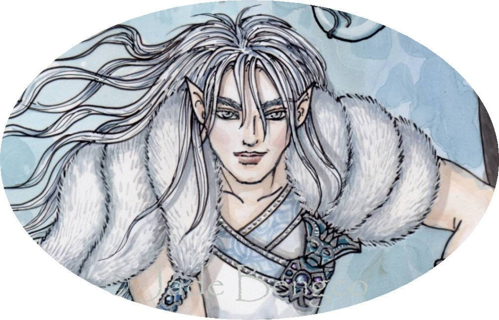 Jack Frost comes to life in this winter fantasy portrait inspired by Japanese anime. With pointed elf-like ears, icy grey eyes, and white hair, Jack balances gracefully on a frosted tree laden with glassy, orb-like fruit. Wrapped in furs and adorned with pale blue jewels, he surveys his snowy realm while a plump snow owl peers out from her burrow below. A serene yet powerful depiction of winter’s magic and mystery.