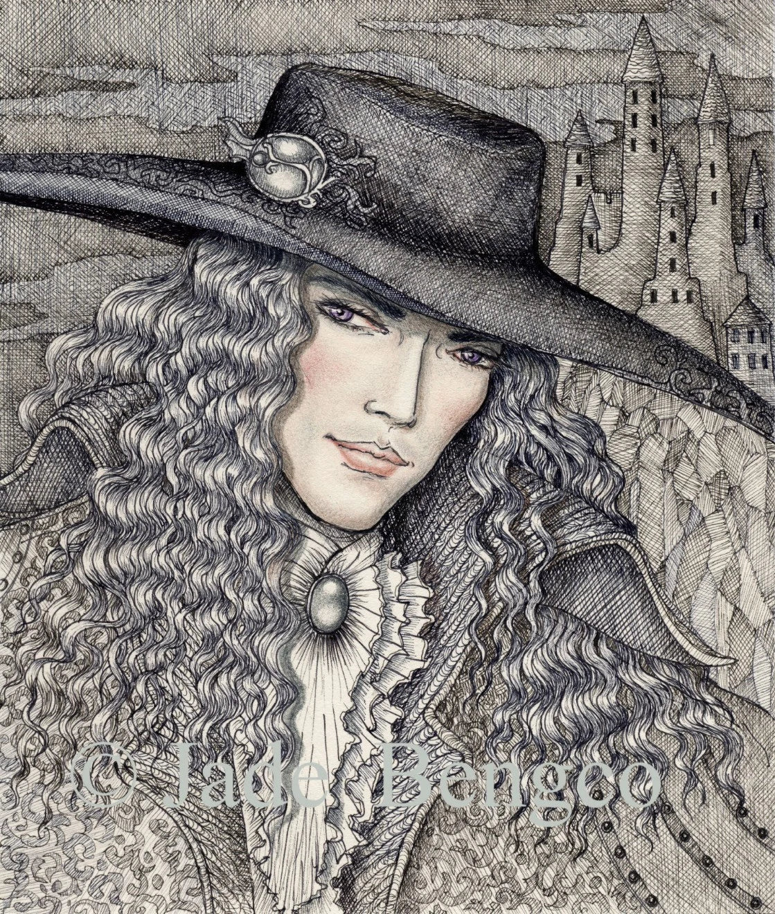 Titled Night Hunter, this limited edition vampire art print was inspired by a beloved Japanese anime character, reimagined through the artist’s distinctive gothic lens. The piece portrays a striking human-vampire hybrid—powerful, brooding, and irresistibly alluring—who walks the line between darkness and heroism. Created using ink pens for deep tonal contrast and subtle pencil accents for warmth, this rare monochrome work exudes atmosphere and elegance. A must-have for fans of anime, dark fantasy, and immortal antiheroes.