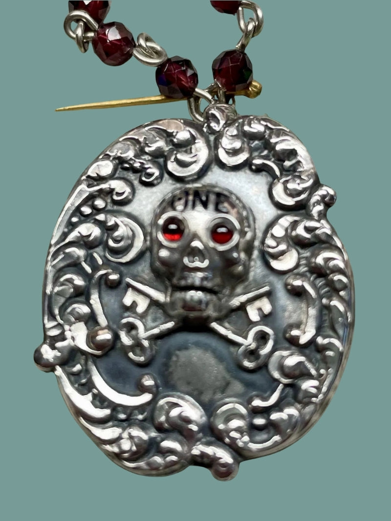This mysterious and feminine OOAK necklace features faceted genuine garnets in two sizes (3mm and 5mm) linked with nickel silver wire, ending in a rare vintage belt buckle clasp. The focal point is a sterling silver pendant, likely from the 1950s or earlier, depicting a skull with crossed keys and tiny garnet cabochon eyes. The word “ONE” is embossed on the skull’s forehead, hinting at its secret past—perhaps from a fraternity or symbolic order. A striking and elegant piece that combines vintage rarity, symbolism, and handcrafted artistry.