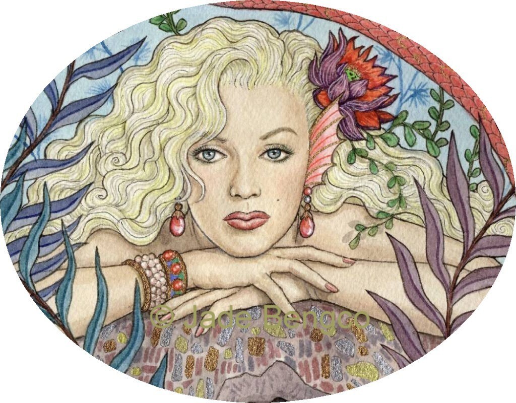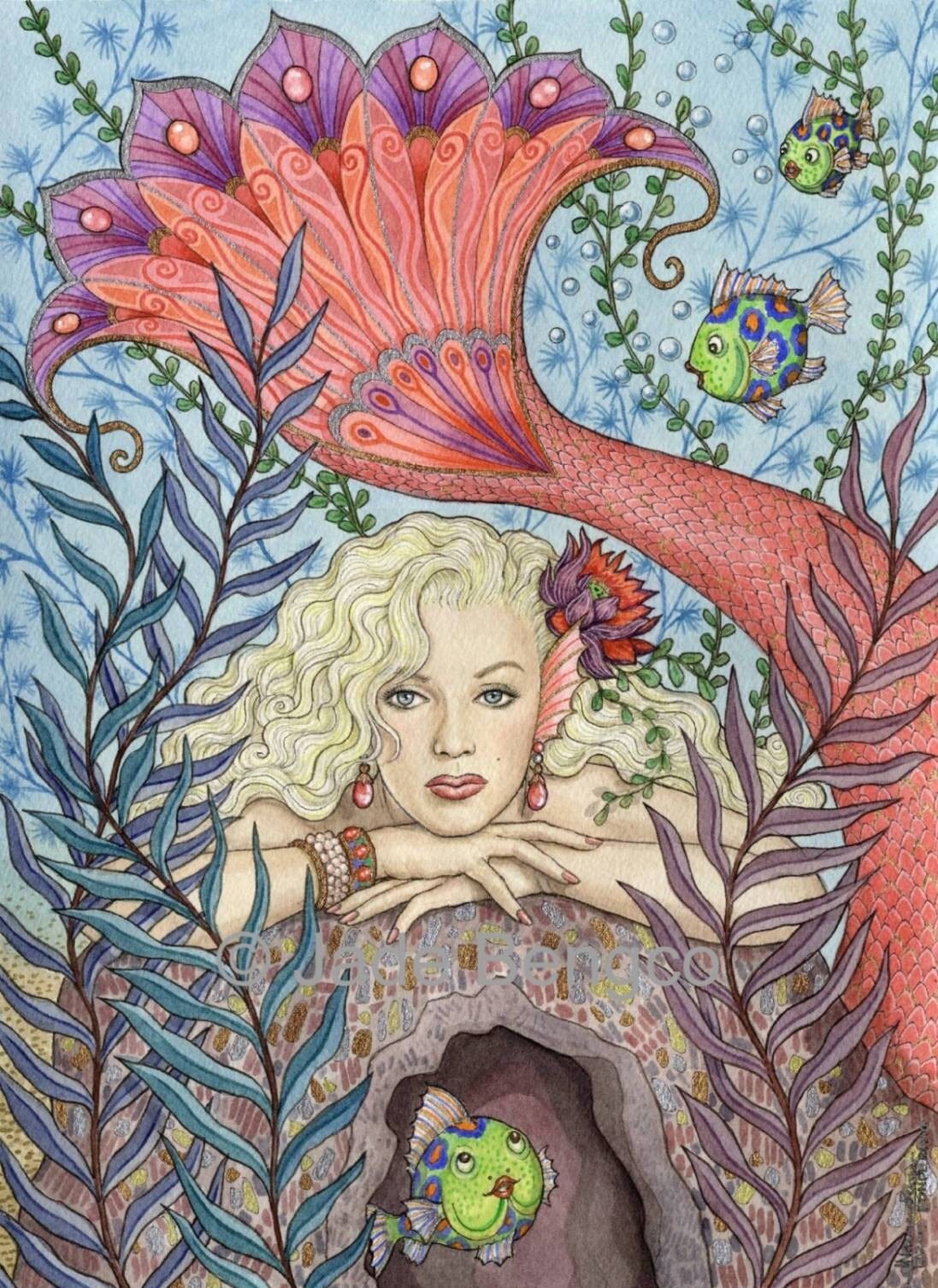 Inspired by 1940s glamour, this limited edition art print features a stunning platinum blonde mermaid adorned in jewels from head to tail. Reclining on a coral encrusted with precious metals and watched by curious, chubby fish, she exudes sultry elegance with her pouty lips, heavy-lidded eyes, and luminous coral-pink tail. A perfect piece for collectors of mermaid art, vintage-inspired fantasy, and ocean-themed decor.