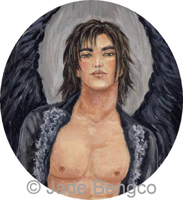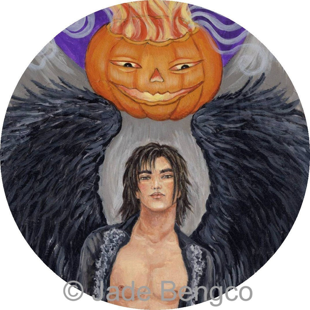 Celebrate Halloween with this striking fantasy art print featuring a hunky, raven-winged angel emerging from swirling mists under the watchful grin of a towering jack-o’-lantern spirit. Dressed in black lace and leather, with tousled hair, dark eyes, and a touch of danger, he embodies gothic allure and mystery. Perfect for collectors of Halloween, fantasy, and dark angel art—this piece captures the seductive magic of the season in bold, dramatic style.