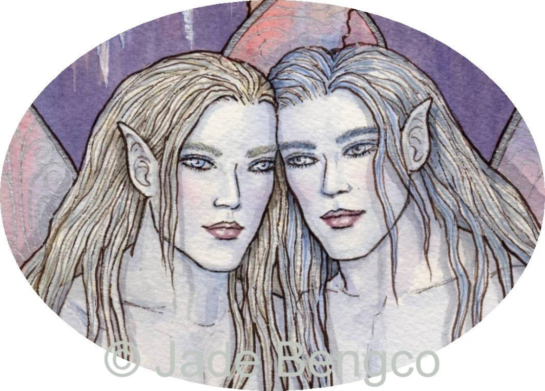 Titled Siblings, this limited edition fantasy art print features two striking Crystal Ice Fairy brothers—pale-haired, blue-eyed, and beautifully tattooed. Their cool elegance contrasts with their undeniable allure, bringing warmth to their icy realm. Rendered in a soft, frosty palette of blues, silvers, and whites, this piece captures both strength and sensuality—perfect for collectors who appreciate fantasy art with a touch of mystique and beauty.