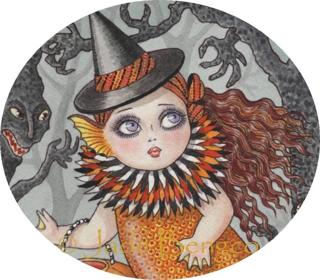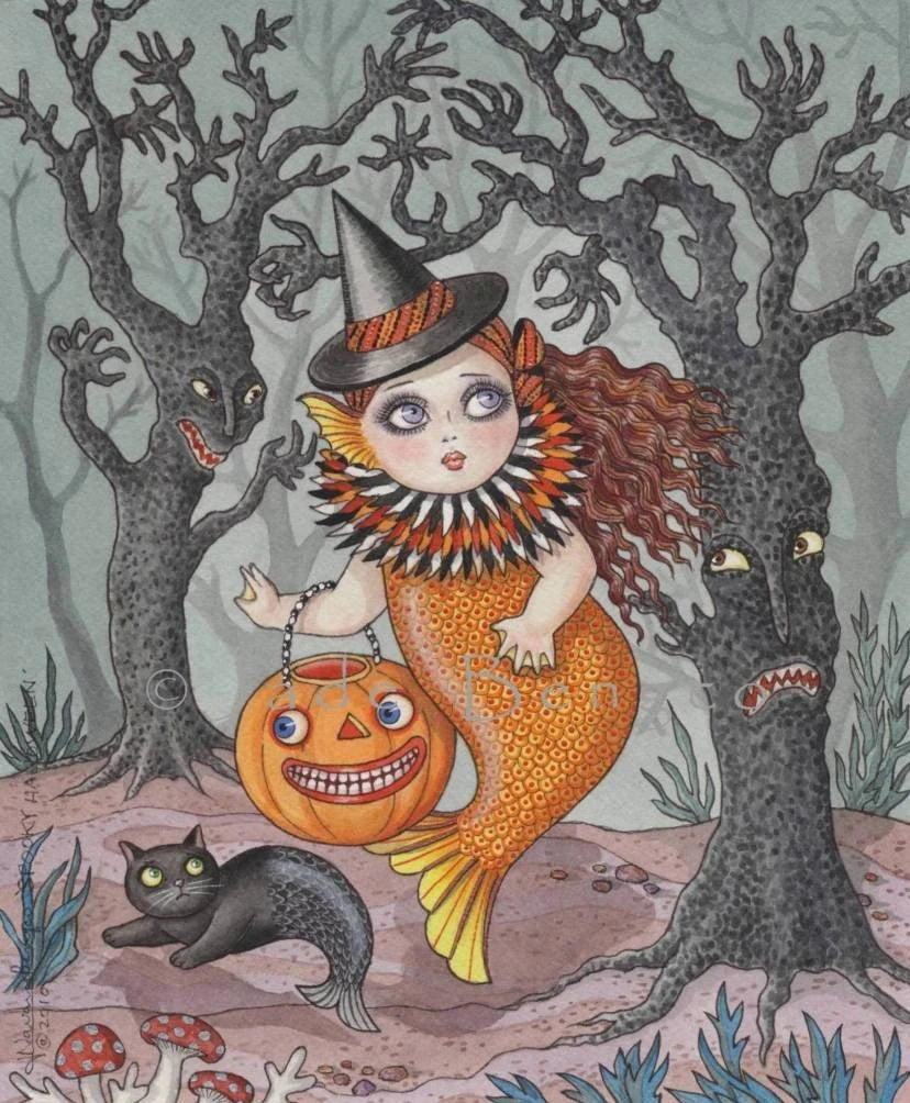 Titled Spooky Halloween, this limited edition fantasy art print captures a chubby young mermaid witch and her black mercat familiar on their way to the Undersea Masked Ball. With a glowing jack-o’-lantern in tow, they hurry through the eerie Spooky Coral Woods—where the dark coral “trees” seem almost alive under the Halloween moonlight. Painted in rich, vibrant colors, this whimsical underwater scene perfectly blends fantasy and festive charm, making it a delightful addition to any Halloween art collection.