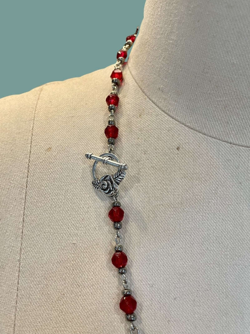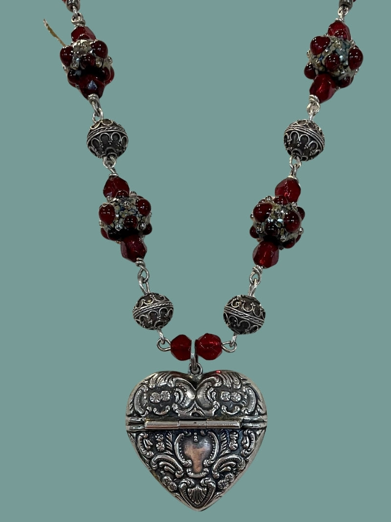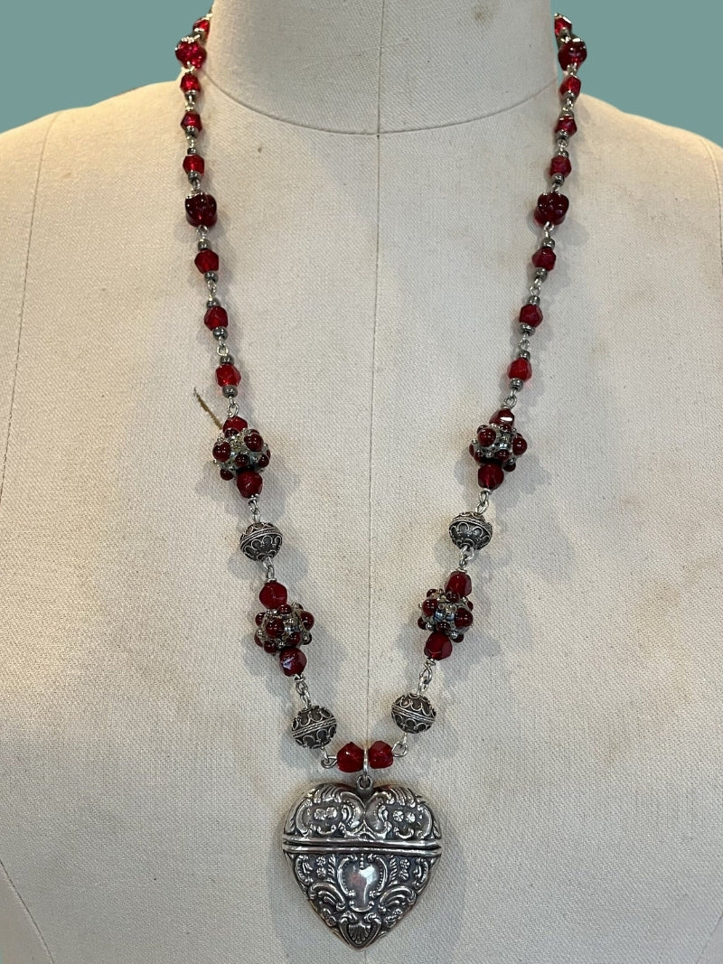 Titled The Fanciful Heart, this exquisite one-of-a-kind necklace blends vintage elegance with timeless romance. Composed of vintage English-cut faceted red glass beads, Czech glass accents, red melon beads, and artisan lampwork details, it’s intricately wire-wrapped in nickel silver for durability and charm. The centerpiece—a vintage sterling silver heart ‘case’ adorned with floral scrollwork repoussé—adds a touch of antique sophistication. Likely dating from the early 1930s, the heart pendant still closes securely, with only a faint gap that adds to its vintage authenticity. Finished with a pewter alloy toggle clasp featuring a rose motif, this necklace perfectly captures the spirit of love and nostalgia. A stunning keepsake piece ideal for vintage jewelry enthusiasts and collectors of handmade artisan adornments.