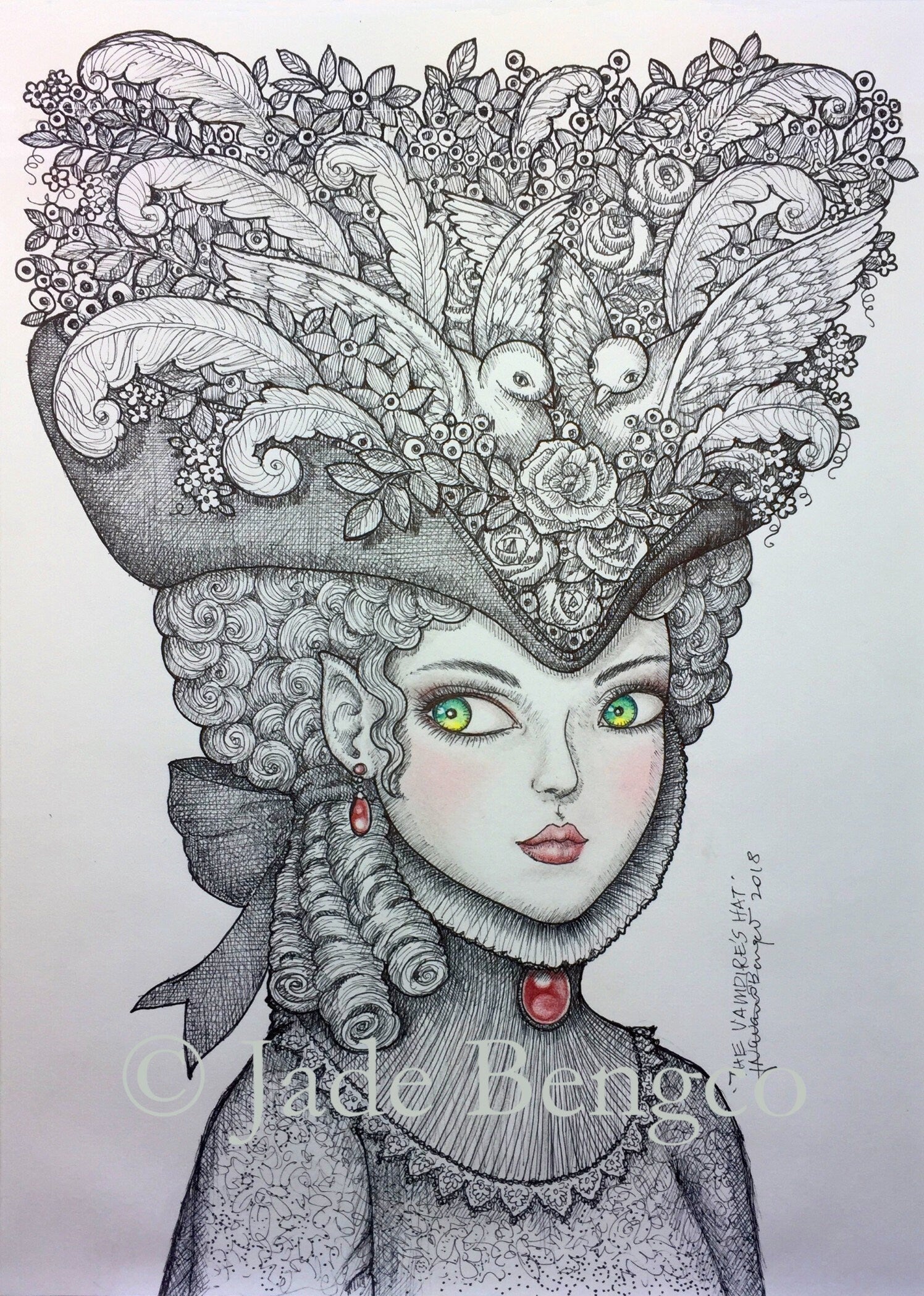 Titled The Vampire’s Hat, this striking original fantasy illustration features a regal lady vampire—an elegant Vampiress—stepping out at dusk beneath the brim of an enormous hat. Her glowing chartreuse eyes catch the fading light as she spares a glance toward a possible victim, though tonight, she decides restraint is best—she wouldn’t dare risk her exquisite Regency lace gown or her new hat from the milliner’s! Rendered with fine detail using three pen points and subtle pencil accents for her jewels, lips, and luminous eyes, this piece combines gothic drama with refined whimsy. A small paper extension was seamlessly added to enhance the grand scale of her hat—barely noticeable and invisible once framed. A perfect piece for collectors of gothic, Halloween, or pen-and-ink fantasy art.